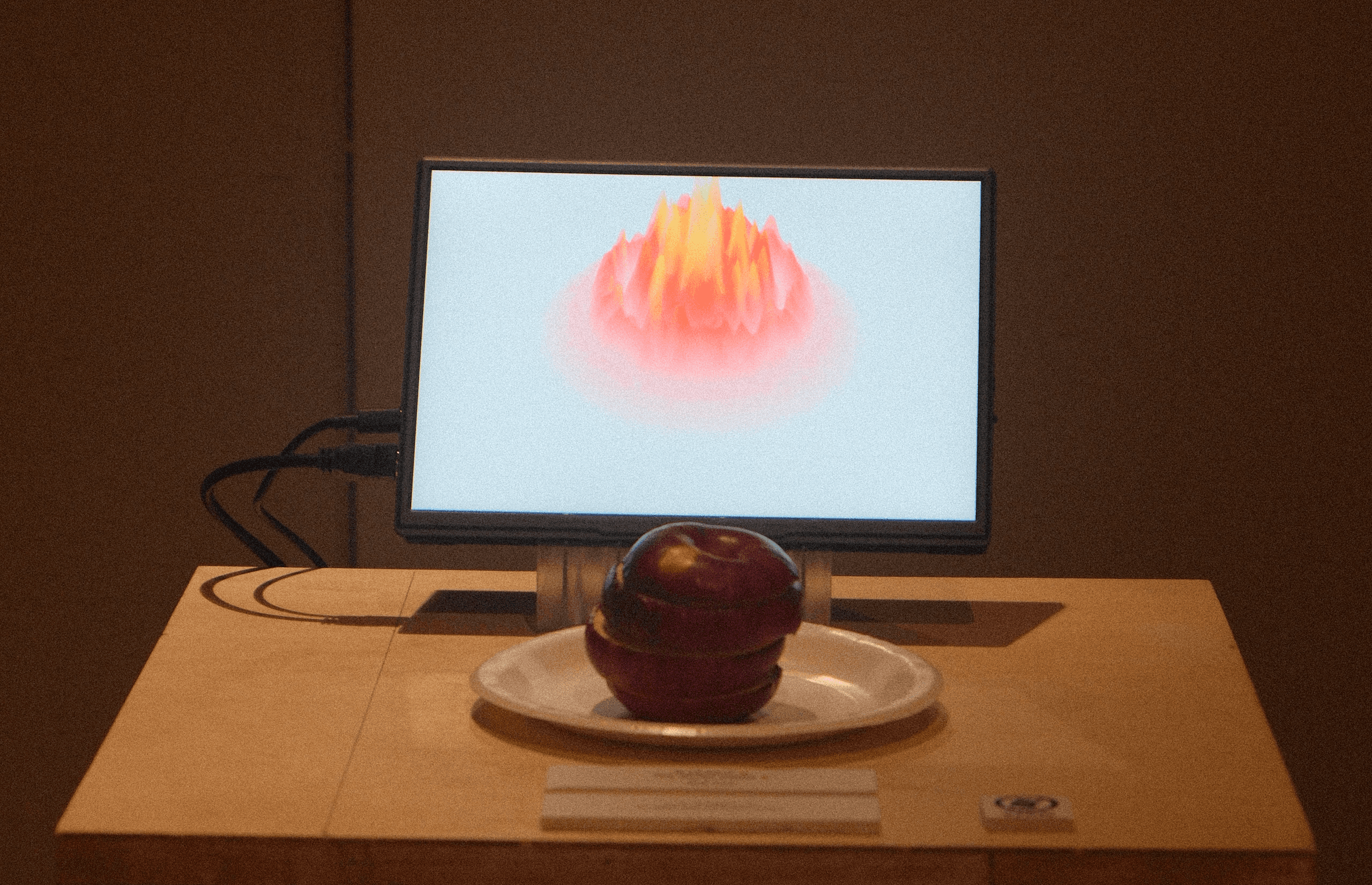 As the apple passes through visual, sonic, and visual states, its form is not fixed but continually re-formed through perception. The work dwells in this interval, where sensation folds back onto itself and meaning remains open.