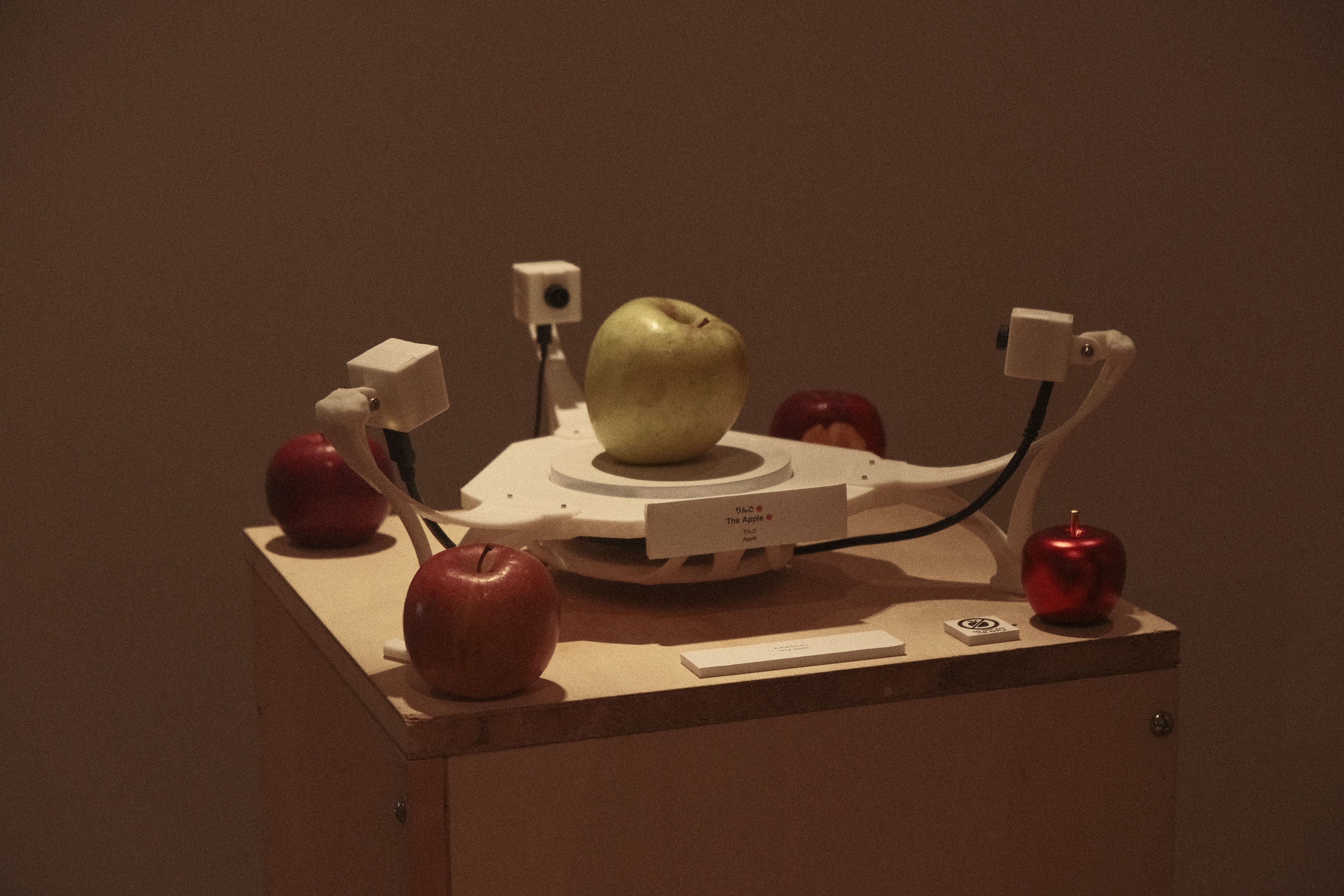 This work is an interactive sound installation that translates the physical properties of apples into sound. Through interaction, apples become active agents within the system, generating sonic responses based on their material presence rather than predefined symbolic meanings.